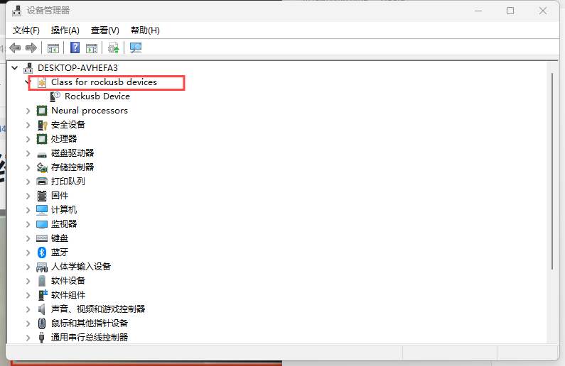 查看是否有上图中Class for rockusb devices设备,如果没有,请重复安装驱动步骤或者重新插拔数据线